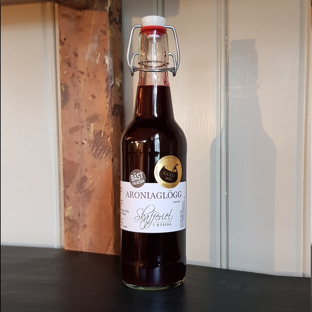 Kallpressad råsaft av aronia, vatten, socker, glöggkryddor.